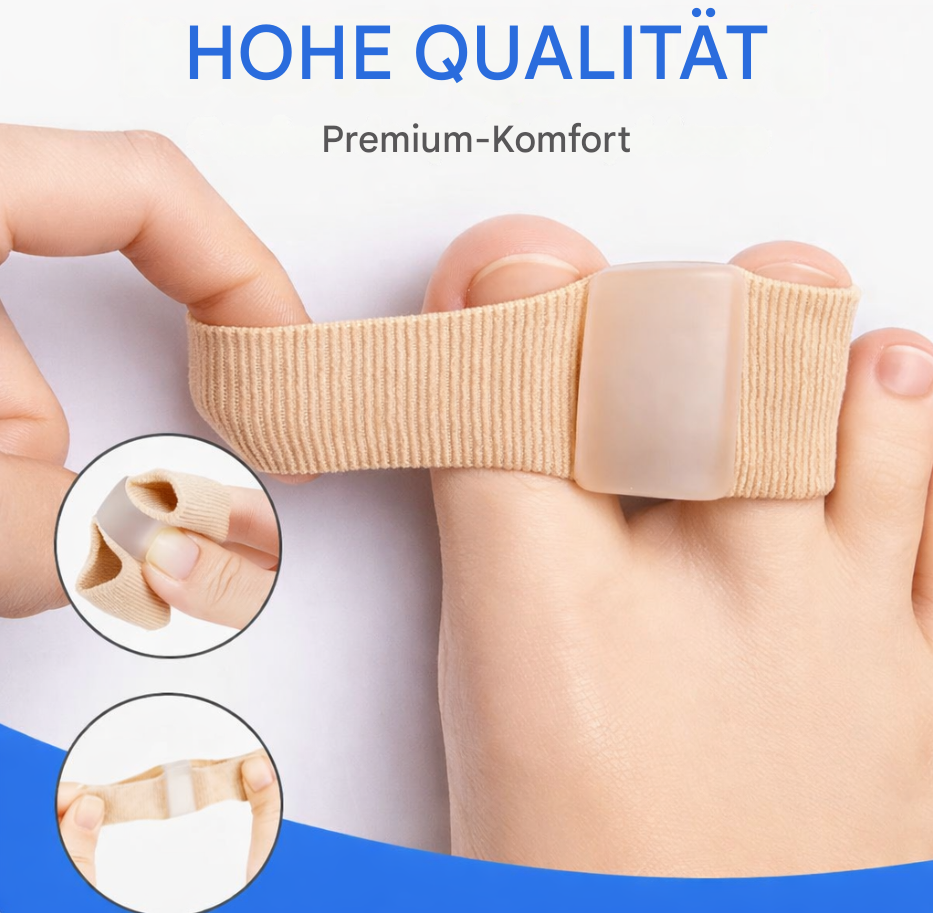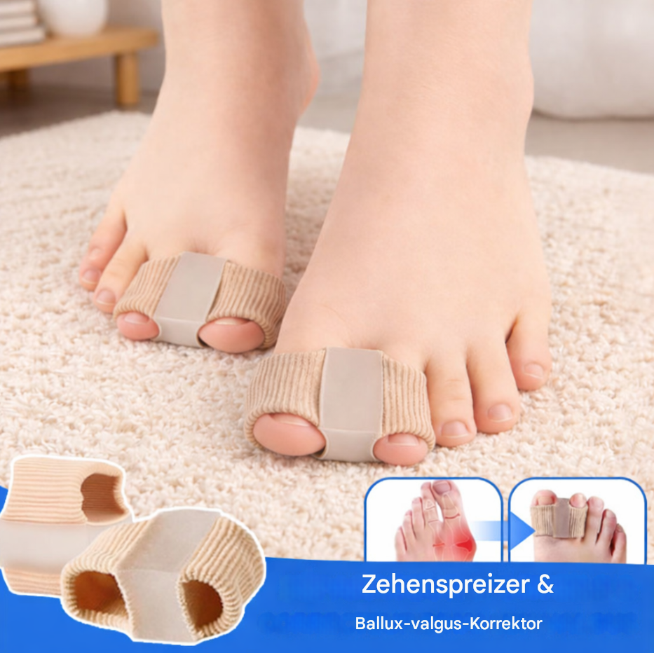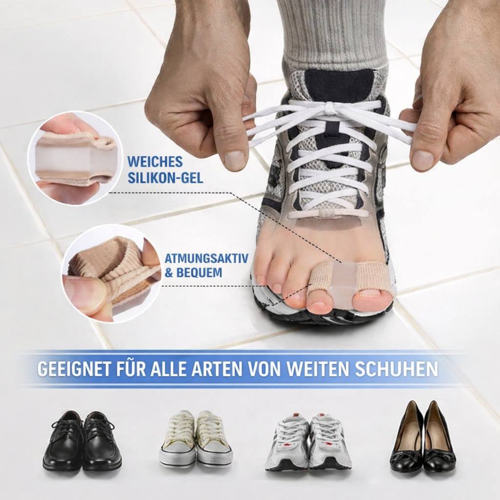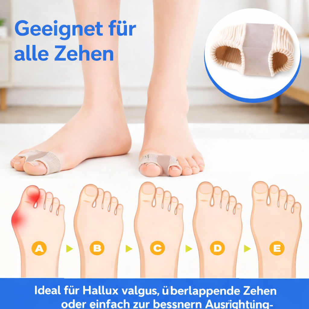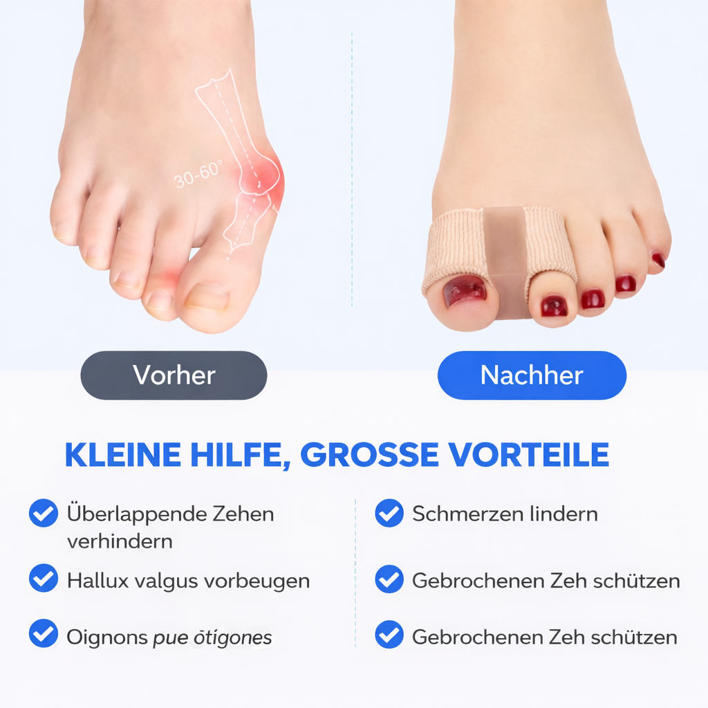 Viele Menschen leiden täglich unter Schmerzen an den Zehen und im Vorfußbereich, verursacht durch Hallux valgus (Schiefstellung des großen Zehs), überlappende Zehen, Hühneraugen oder Druckstellen in Schuhen. Dies kann das Gehen unangenehm machen, Reibung in den Schuhen verursachen und sogar zu anhaltenden Reizungen oder Entzündungen führen.